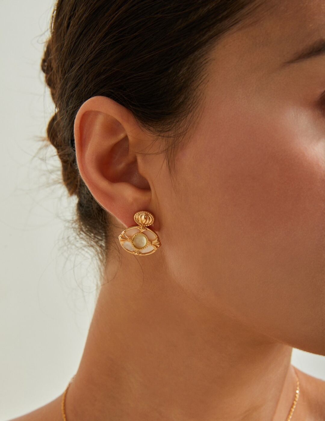 まるで陽光を浴びた葡萄のように、みずみずしく輝く葡萄玉髓(グレープアゲート)。そこに静かな光沢を放つ白蝶貝を添え、クラシカルな美しさと現代的な洗練を兼ね備えたデザインに仕上げました。ゴールドコーティングを施したSV925の地金が、耳元に上品な存在感を演出し、身に着けるだけで自然と背筋が伸びるような、自信と気品を纏える逸品です。葡萄瑪瑙は、心を穏やかにし、豊かさをもたらすとともに、あなたのスタイルを際立たせる存在になります!特別な日からデイリーユースまで幅広く活躍する、飽きることのない美しさを持っています。